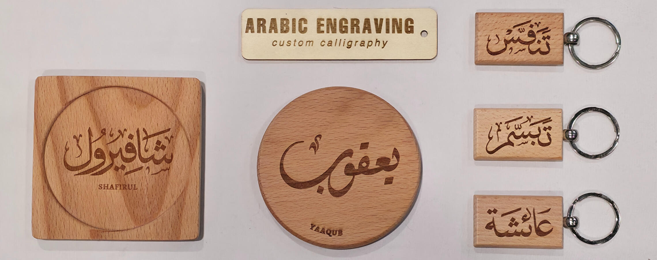 Engraved on wooden keychains, coasters, and more.✅ Hand-designed Arabic calligraphy